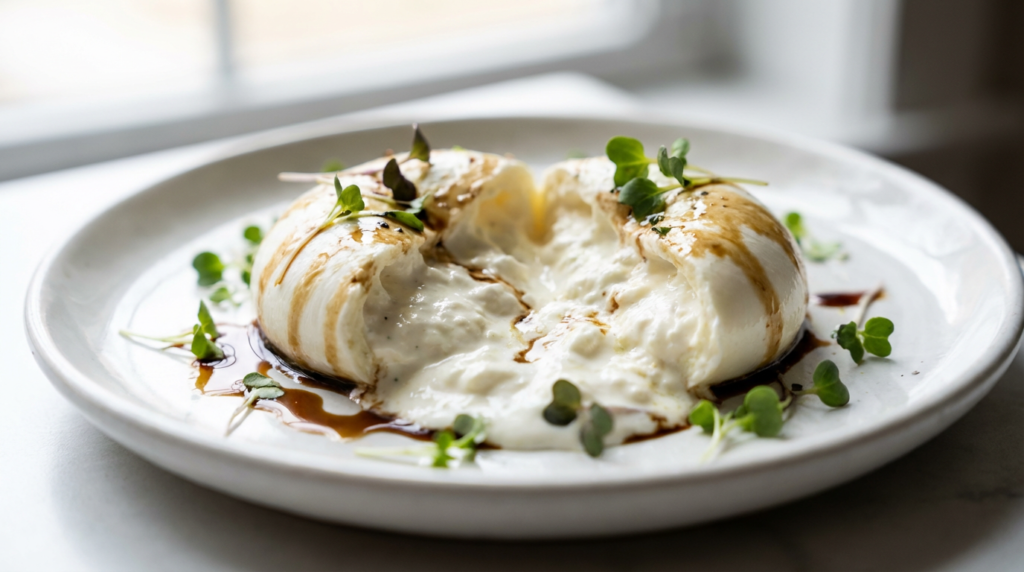 Most people buy Burrata and immediately refrigerate it. Don’t. Temperature control determines everything with creamy Italian cheese. I learned in Puglia that the optimal technique involves keeping it in a cool bowl of water for approximately one hour before serving this loosens the stracciatella filling and releases those delicate cream flavors that make Burrata legendary.